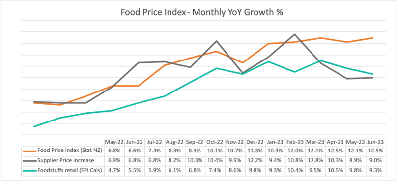 - Stats NZ Food Price Index (FPI) shows food prices increased 12.5% for June 2023 compared to a year ago.