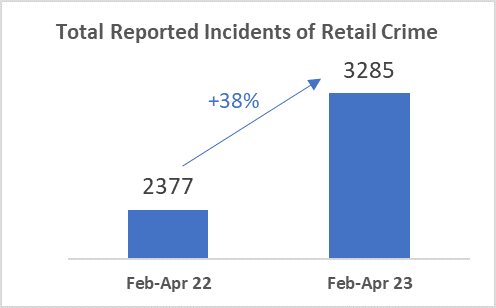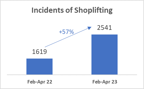 - 2,541 incidents were related to shoplifting – that's a 57% increase year on year for February-April