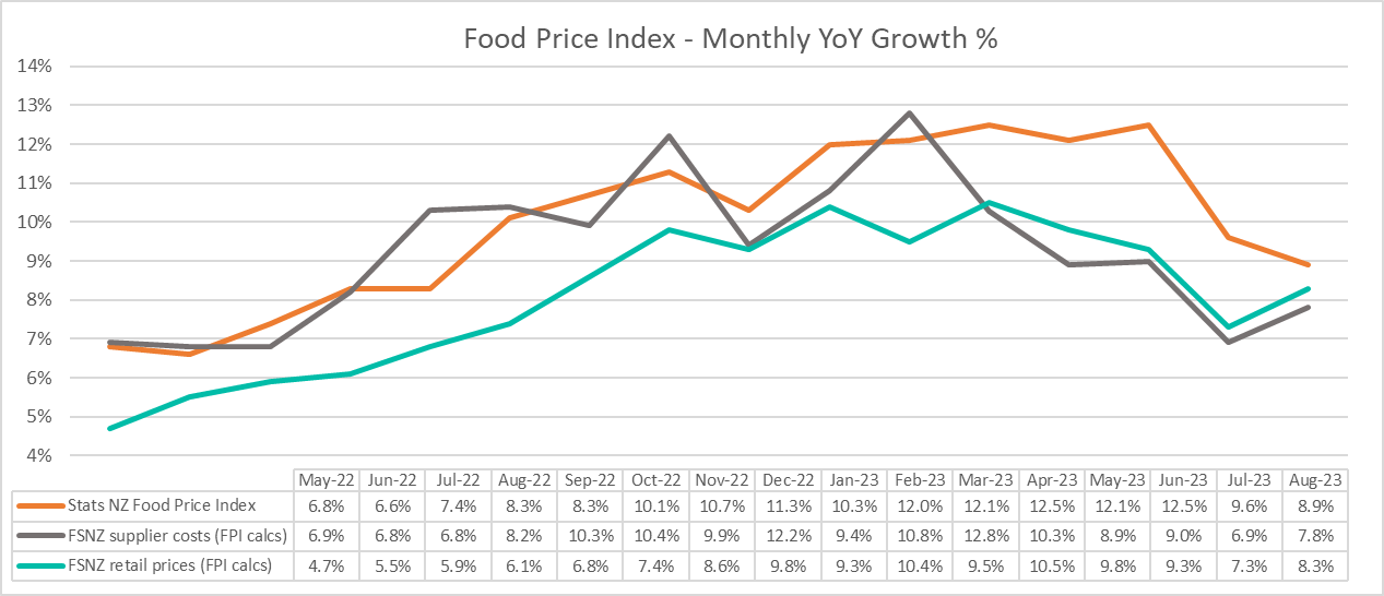 - Stats NZ’s Food Price Index (FPI) shows food prices on their FPI basket measure increased 8.9% year-on year in August 2023, compared to 9.6% in July 2023.