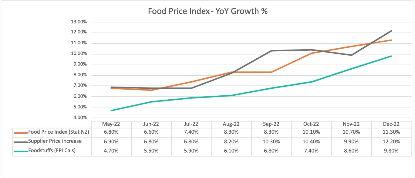 - Stats NZ Food Price Index (FPI) shows food prices increased 11.3% for December 2022 compared to a year ago, the biggest annual increase since April 1990.