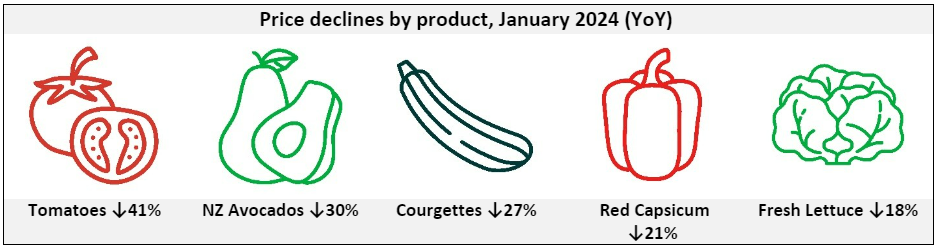 While Foodstuffs’ prices for the FPI categories were up an average 3.9%pa in January, compared to a year earlier, and supplier costs for the same categories rose an average 5.8%pa, many fresh food favourites saw significant year-on-year price falls at Foodstuffs’ stores, including those shown below:
