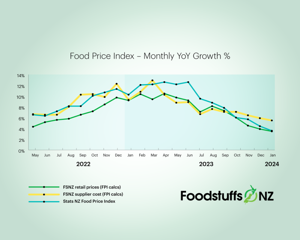 Stats NZ has today reported a 4.0%pa increase in the Food Price Index (FPI) – its official monthly measure of food price inflation in New Zealand – for January 2024.