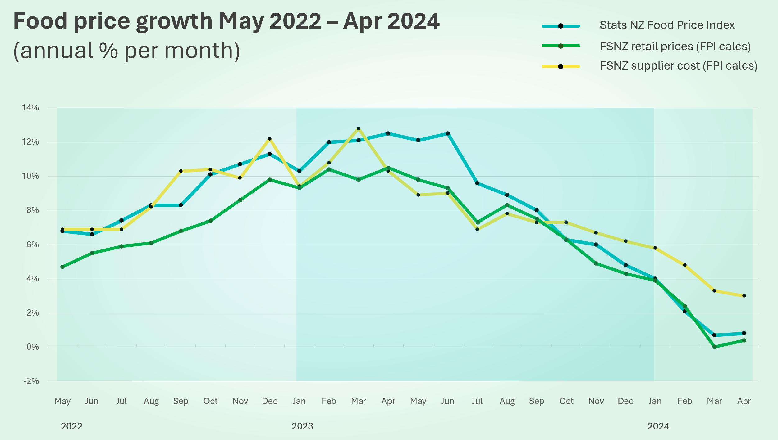 In mid-2022, the co-ops started comparing the average rate of price increases across their stores, for foods in the same categories Stats NZ uses in its food inflation ‘basket’.* In the 24 months since, their average rate of increase has almost always been lower than Stats – as shown in the chart below – and in the latest month, April 2024, was just 0.4% year-on-year, compared to Stats’ official rate of 0.8%