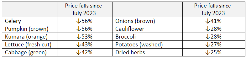 In more abundant supply, and seeing significant year-on-year price deflation as a result, are many fresh seasonal vegetables – accounting for nine of Foodstuffs’ top-ten price falls shown in the table below: