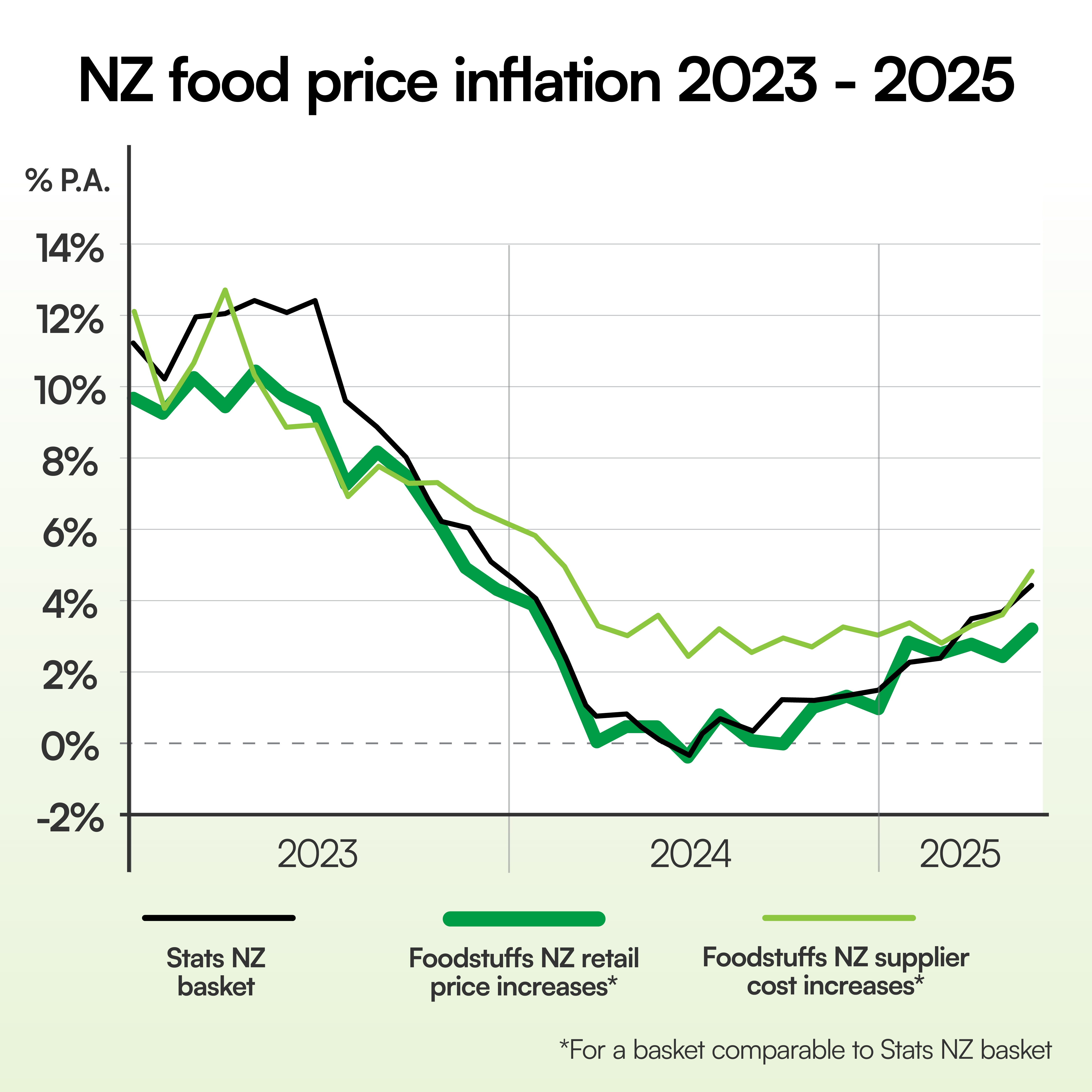 • Stats NZ records 4.4% annual food price inflation (FPI) in May 2025 • Foodstuffs see retail prices rise 3.2% YOY for their comparable FPI basket of products • Global prices continue to drive NZ price increases for butter, cheese, beef and lamb • Tomato prices up 30% YOY as ongoing ban on Australian imports impacts overall supply