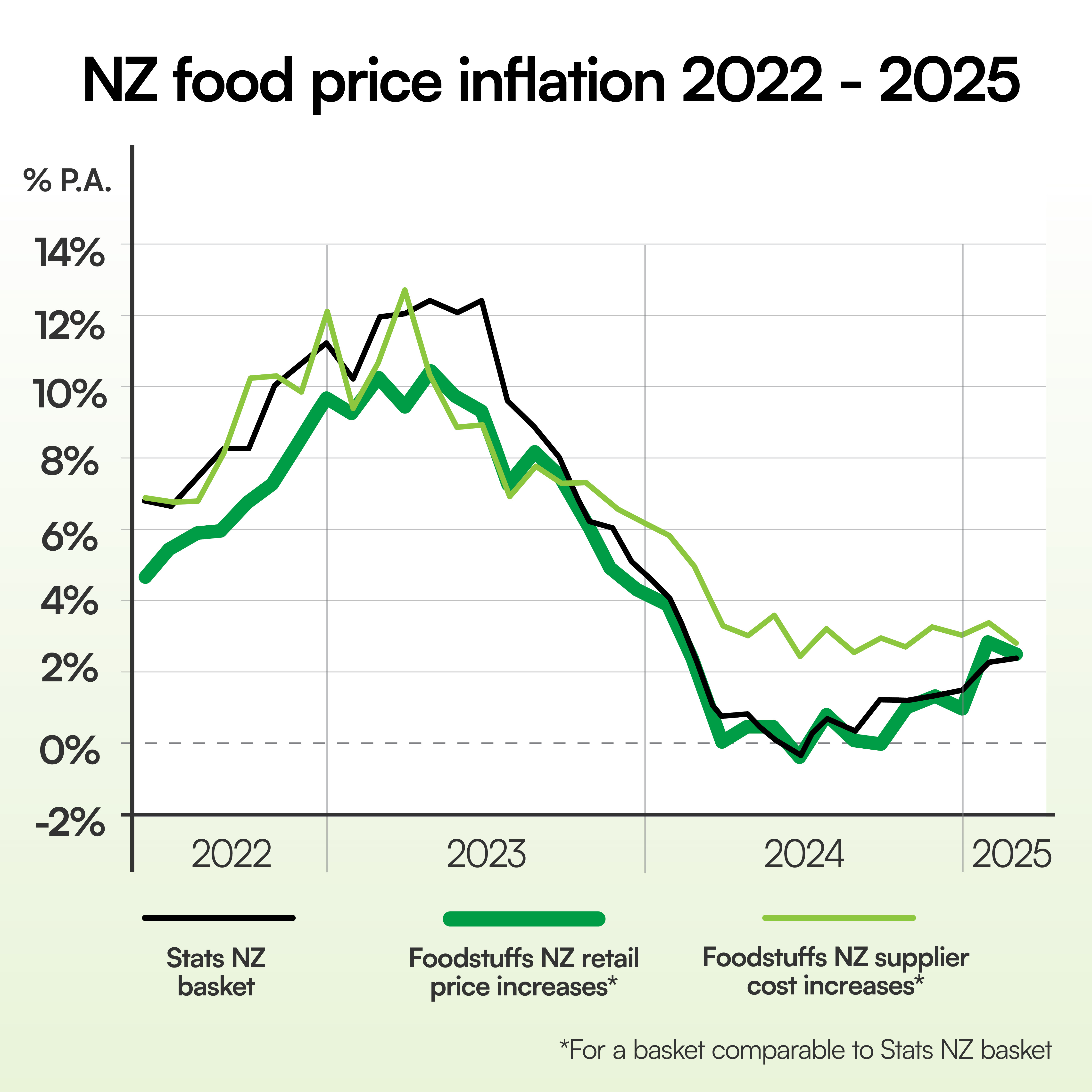 Strong global demand for New Zealand’s key export commodities – dairy and meat – continues to drive food price inflation, say the Foodstuffs co-ops, with the US and UK also experiencing higher food price inflation since the start of 2025. Stats NZ today reported a nationwide annual food price inflation (FPI) rate of 2.4% for February, while the co-ops recorded an average 2.5% year on year for their comparable FPI basket. The Foodstuffs co-ops have been monitoring FPI across their 500+ stores – including every New World, Four Square and PAK’nSAVE – since mid-2022, measuring the prices of a basket of goods in the same categories that Stats NZ monitors, using the same methodology and weightings. Both rates peaked in April 2023, when Stats recorded 12.5%, and the co-ops’ 10.5%. Both then bottomed out in June 2024, recording deflationary figures of -0.3% and -0.5%, respectively. Foodstuffs NZ Managing Director Chris Quin says the latest rate for February confirms food price inflation is still within the target range of 1-3%, where it’s been for the past five months. “At a specific product level, February’s rate was again heavily influenced by the price of olive oil, which is still almost double (87.5%) a year ago,” he says. “At a broader category level, while February saw a year-on-year decrease for fruit and veg, that was offset by a rise for meat, poultry and fish. “Meat prices are up due to strong global demand for New Zealand beef and lamb, which highlights the exceptional quality our farmers produce, and benefits rural communities too. What Kiwis pay at the checkout is largely driven by what the world is willing to pay, though, and with demand up and supply down, that’s significantly more than a year ago. “At the same time, we note that food price inflation is up in two comparable markets overseas: the US has just reported 2.6% FPI in February, while the UK saw 3.3% in January – the highest either has seen in the last 12 months. So, an upward trend is noticeable after the lows seen mid-last year, but thankfully we’re still well below the highs of 2022-23. “The big unknown right now is the looming impact of the tariff wars overseas, which could make some foods cheaper if suppliers seek alternative markets but could make some foods costlier if producers are paying more for ingredients. All we know is that some disruptions are expected.” Specific foods that saw the biggest price decreases at the Foodstuffs co-ops in February were orange kūmara (down -54% YOY), yellow capsicum (-33%) and telegraph cucumber (-29%). Foodstuffs’ produce specialists say prices were largely stable in February thanks to the sunny weather, with particularly good value for capsicums and tomatoes, as well as melons and berries. Looking ahead, they say produce prices could see some volatility due to the currency exchange rate affecting fruit imports, and dry conditions affecting the west of the North Island.1 “We’ve always said that two unpredictable factors play a big part in New Zealand food prices: global market forces, such as the supply and demand of commodities and strength of the Kiwi dollar, and severe weather events like droughts and cyclones, here and overseas,” says Quin. The co-ops’ freight specialists say diesel costs are lower than the same time last year, while shipping costs per container remain elevated. Foodstuffs’ supplier costs rose 2.8% in February (YOY) for goods in the co-ops’ FPI basket. Earlier, Infometrics reported a 1.8% rise in the Grocery Supplier Cost Index across 60,000 goods the co-ops stock, noting higher global prices for NZ dairy and beef and imports like chocolate and coffee. Quin says February 2025 was the seventeenth month in a row that the co-ops’ rate of retail price increases was lower than the rate of supplier cost rises for foods in their FPI basket. “With supplier costs accounting for around two-thirds of the retail shelf price, our co-ops have been absorbing such pressures because we’re determined to keep a lid on food price inflation. “Given the ongoing predictions of more inflation in 2025 due to tariffs, that focus will continue: We’ll keep buying well and running our co-ops, stores and supply chains as efficiently as possible, so we can keep delivering value at the checkout.”