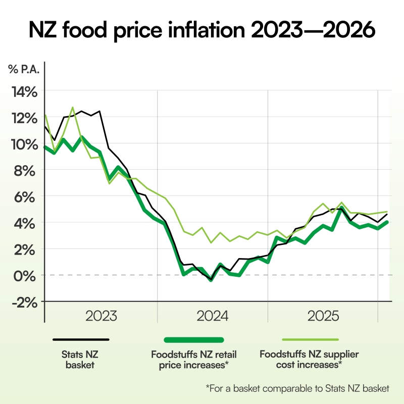 Stats NZ has reported an annual food price inflation (FPI) rate of 4.6% for January, while Foodstuffs recorded an average year-on-year retail price increase of 4.0% across its comparable FPI basket.