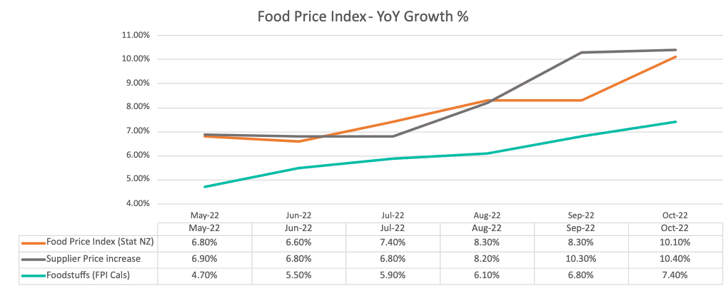Stats NZ Food Price Index (FPI) shows food prices increased 10.1% for October 2022 compared to a year ago.