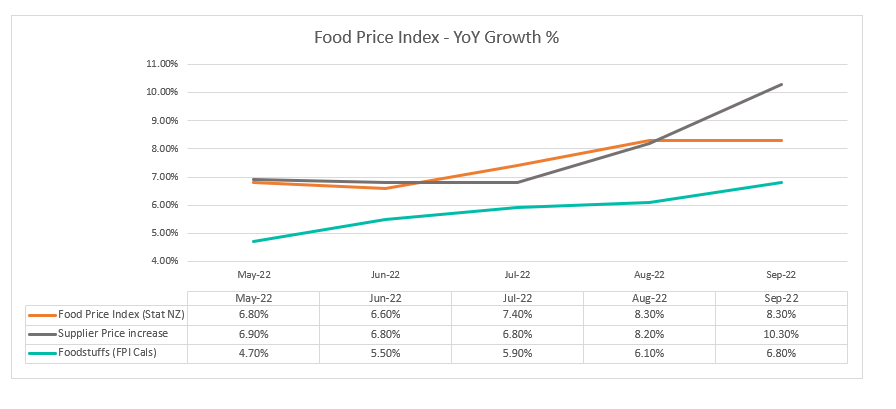 - Stats NZ Food Price Index (FPI) shows food prices increased 8.3% for September 2022 compared to a year ago.
